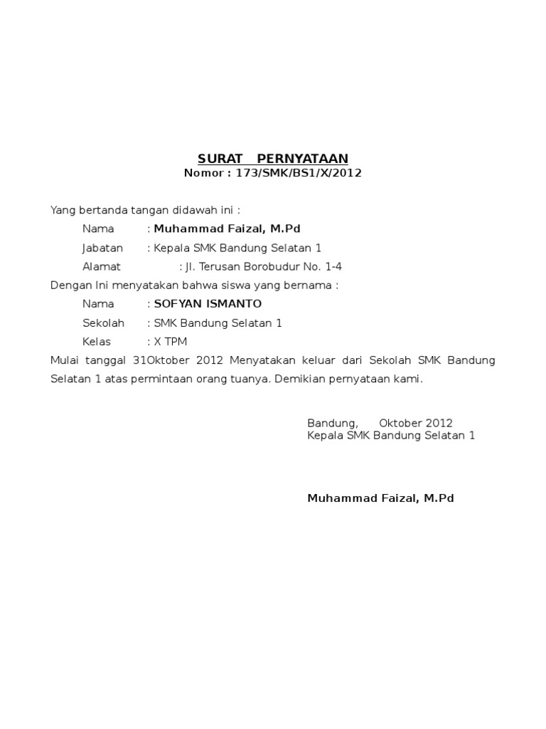 Adapun contohnya adalah surat pernyataan pindah sekolah dari orang tua siswa dengan alasan tertentu. Demikian surat pernyataan ini saya buat dengan sebenarnya dan dengan rasa tanggung jawab yang penuh. Feb 27, 2021 · contoh surat tugas adalah surat yang dikeluarkan oleh perusahaan atau instansi tertentu dan ditujukan kepada karyawan atau anggotanya guna melaksanakan tugas tertentu. Selain pihak pemerintah dan perusahaan, ada juga beberapa yayasan yang memberikan beaiswa kepada siswa/mahasiswa terpilih. Makanan merupakan keperluan asas yang penting untuk menjamin taraf kesihatan yang baik disamping dapat memberi tenaga bagi menjalankan aktiviti kehidupan seharian seperti.